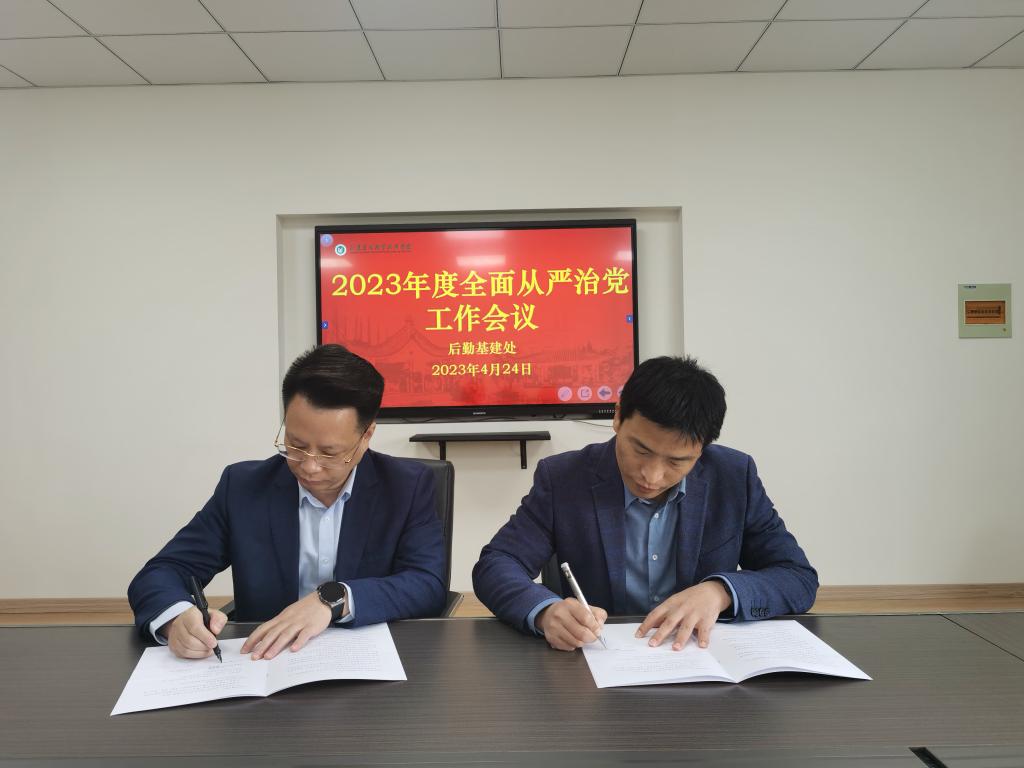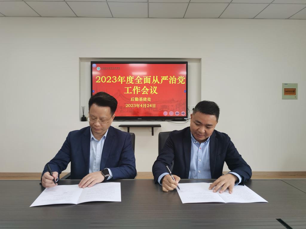 郭俊与班子成员签订《后勤基建处2023年度全面从严治党责任书》,并要求各部门认真对照责任书内容,一要加强内控制度体系建设,根据后勤各工作板块风险点特点,制定廉洁自律相关规定,完善业务制度和流程,依规依程序办事,全面提升后勤治理效能;二是处理好与服务企业间的“亲”“清”关系,业务上充分沟通的同时保持安全距离,不触底线,不碰红线,时刻绷紧廉洁自律之弦。