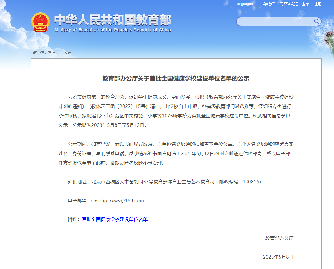 近日,教育部办公厅公示了首批全国健康学校建设单位名单。根据《教育部办公厅关于实施全国健康学校建设计划的通知》(教体艺厅函〔2022〕15号)精神,由学校自主申报、各省级教育部门遴选推荐,经组织专家进行条件审核,拟确定1076所学校为首批全国健康学校建设单位,其中高校273所,我院入选其中。