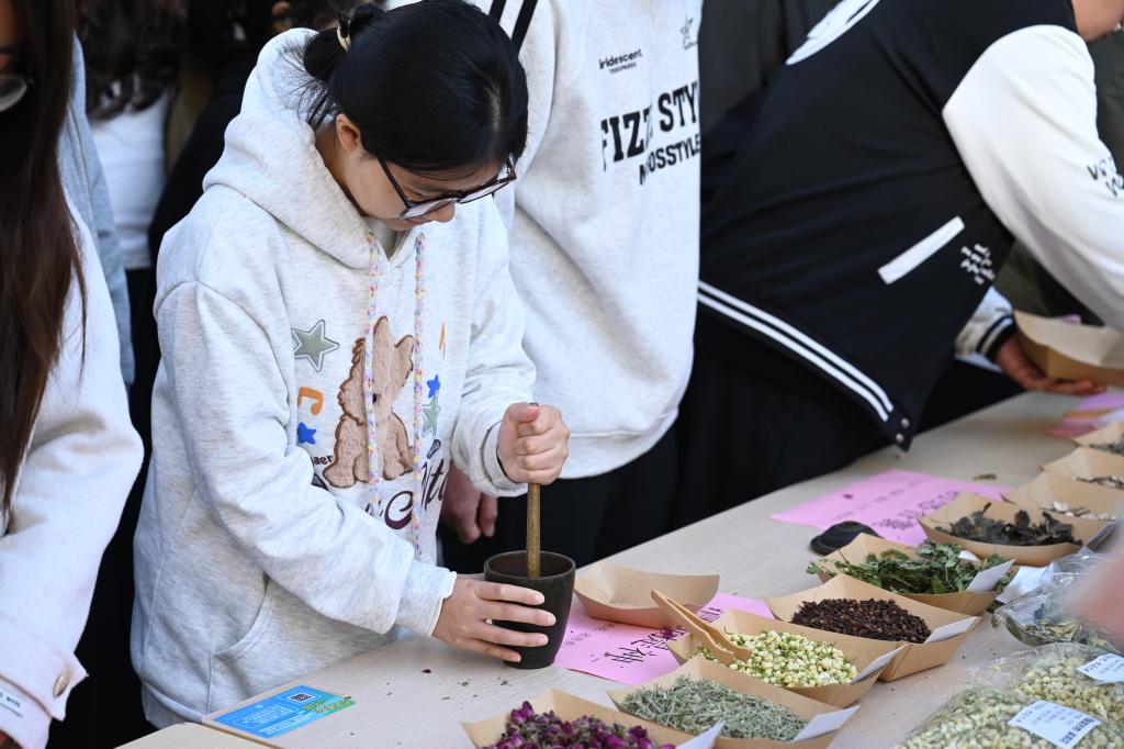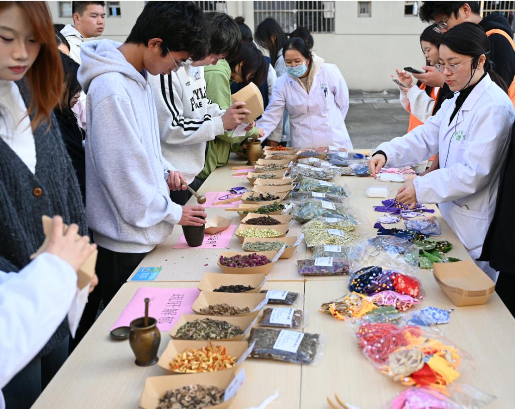中药香囊制作区作为活动核心体验场域,本草芬芳与匠心巧思交织成趣。医师详细介绍薄荷清凉提神、藿香驱蚊避秽、艾叶祛湿散寒等20余中常用中药的功效,现场展示标注清晰的中药样本,学生们俯身闻香辨味,在感官体验中加深对本草特性的认知。领取材料包后,大家结合自身需求搭配中药用量,小心翼翼地将药材装入布袋、系紧棉线,在标签上认真书写中药搭配及功效。一个个承载着健康祈愿的香囊应运而生,既锻炼了动手能力,更让大家在沉浸式体验中加深了对中药文化的理解,以手作之力传递本草温情,以文化传承厚植健康理念。