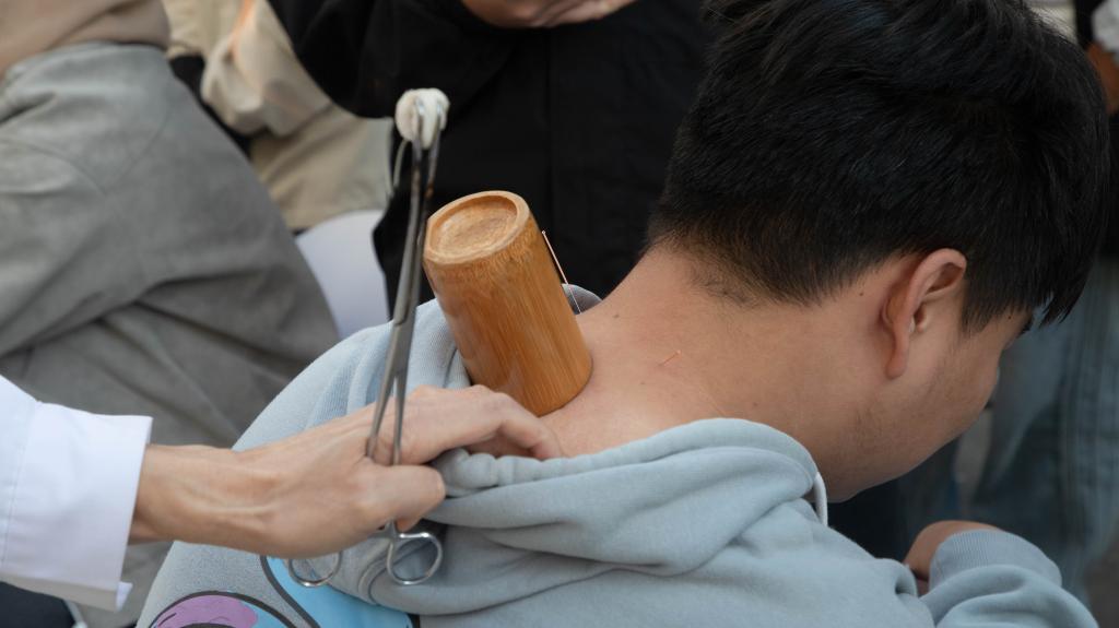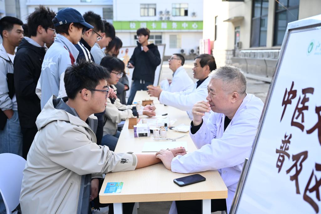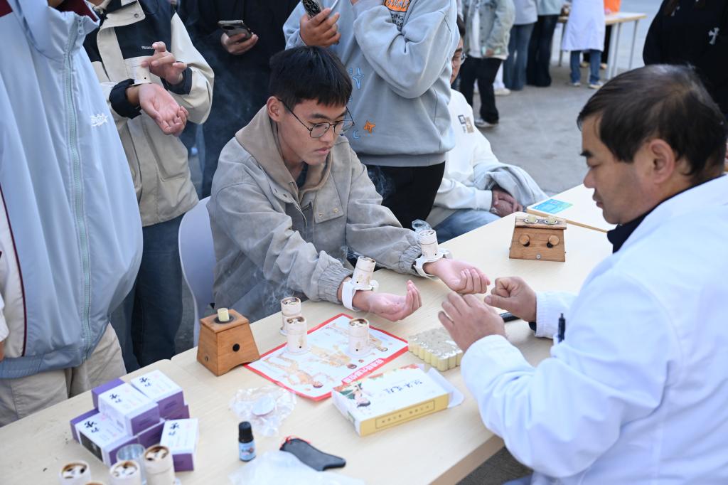 中医文化普及区搭建起传统医学与青年学子的沟通桥梁,让古老中医智慧与现代校园生活深度融合。3名经验丰富的中医师坐诊提供免费基础问诊,通过把脉辨体质,结合日常作息给出针对性调理建议;借助放大版穴位图、针灸模型直观讲解针灸原理,同步开展艾灸、针灸和拔罐体验,让学生在温热舒适的体感中感受中医理疗的独特功效和“辨证施治”的独特魅力。